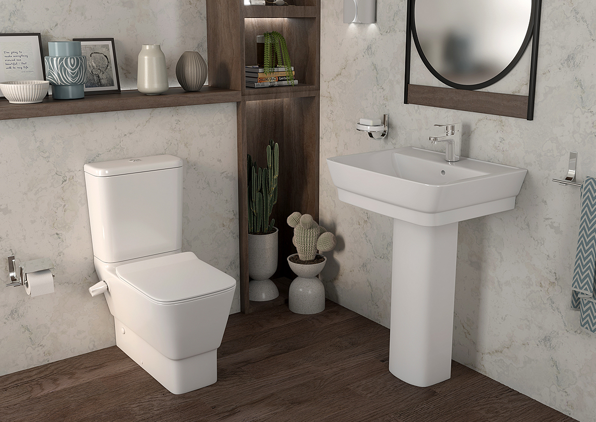 The Trend Set is a stylish and functional bathroom suite featuring a pedestal sink, a two-piece toilet, and a toilet seat. Crafted from high-quality white ceramic, it's both durable and easy to clean. Its sleek, modern design is perfect for contemporary bathrooms.