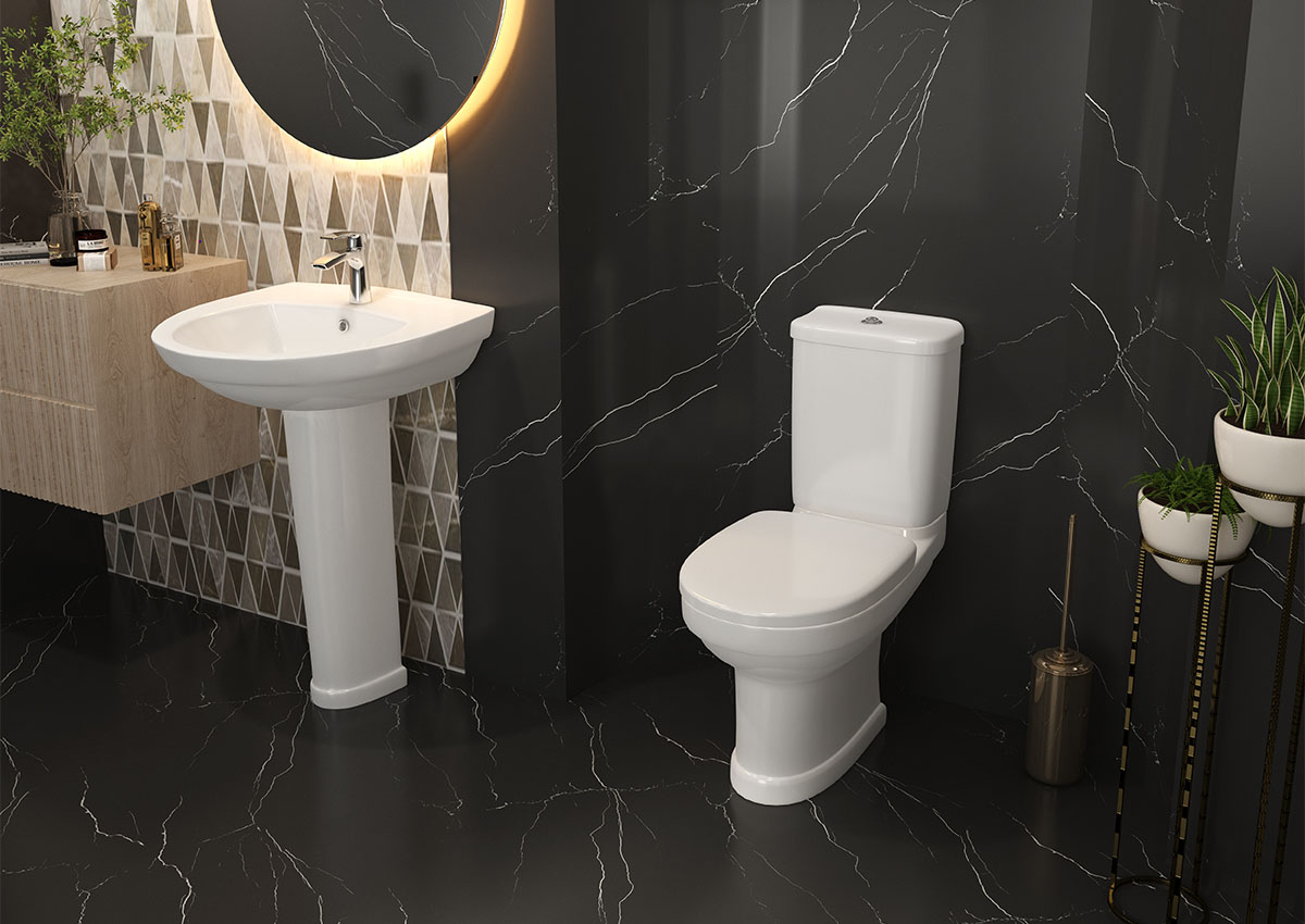 Add a touch of luxury with the smooth-flowing curves of the Capri suite. This range will add infinite finesse, warmth & harmony to any bathroom. Close Coupled WC Suite available in (P) trap. With push button flush. 55 cm basin & with pedestal, available with 1 tap hole.