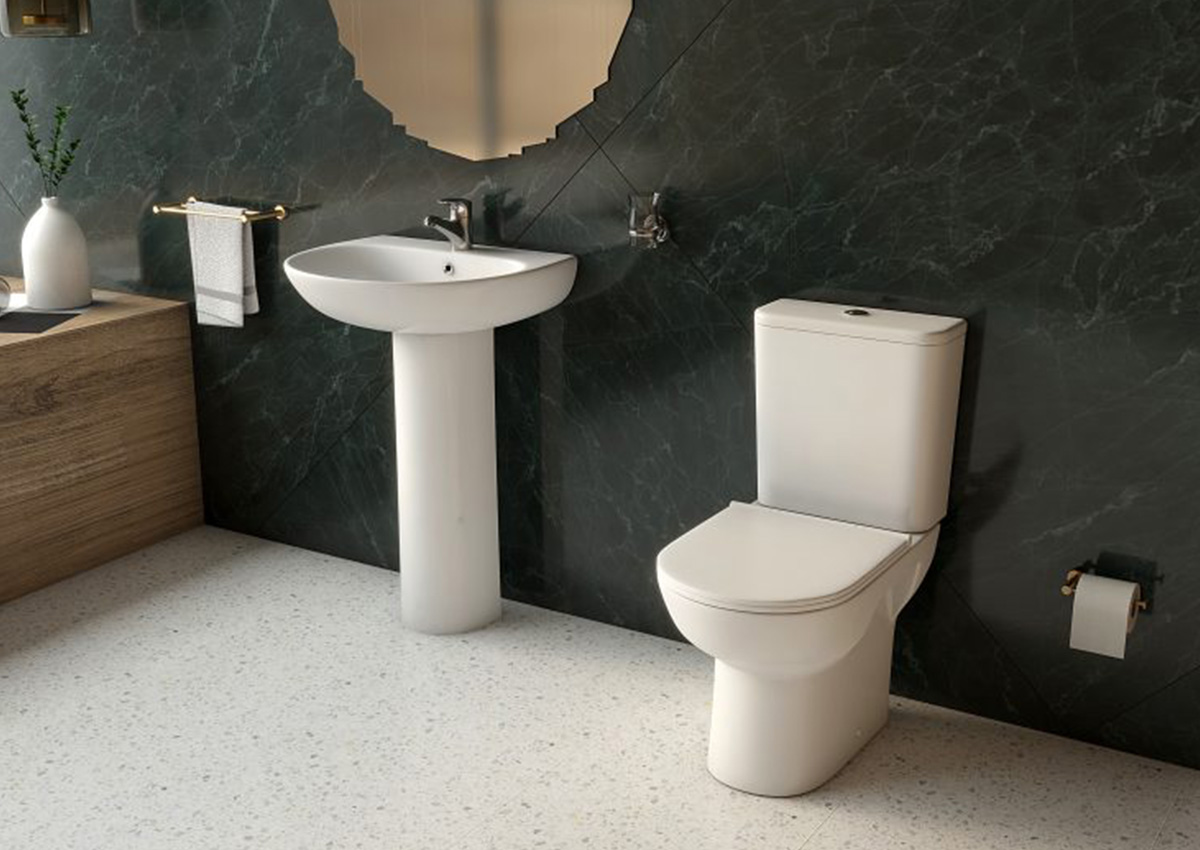 The H-Line Round Set is a comprehensive bathroom solution featuring a toilet, basin, and pedestal. Its contemporary, stylish design caters to modern bathroom preferences, offering a cohesive and functional ensemble.